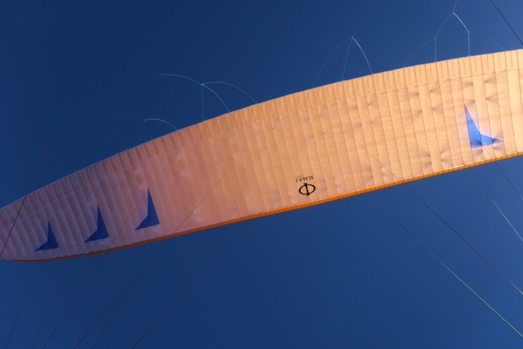 La SCALA 2 LIGHT se pilote de façon très classique avec une course de freins assez longue, mais avec une excellente précision et redoutable réactivité. Malgré les thermiques “boulets de canon”, je me sens bien à l’aise et je n’ai pas besoin d’incessantes actions rapides des commandes. La voile se comporte dans les turbulences de la même façon que les EN-B plus que j’aime !